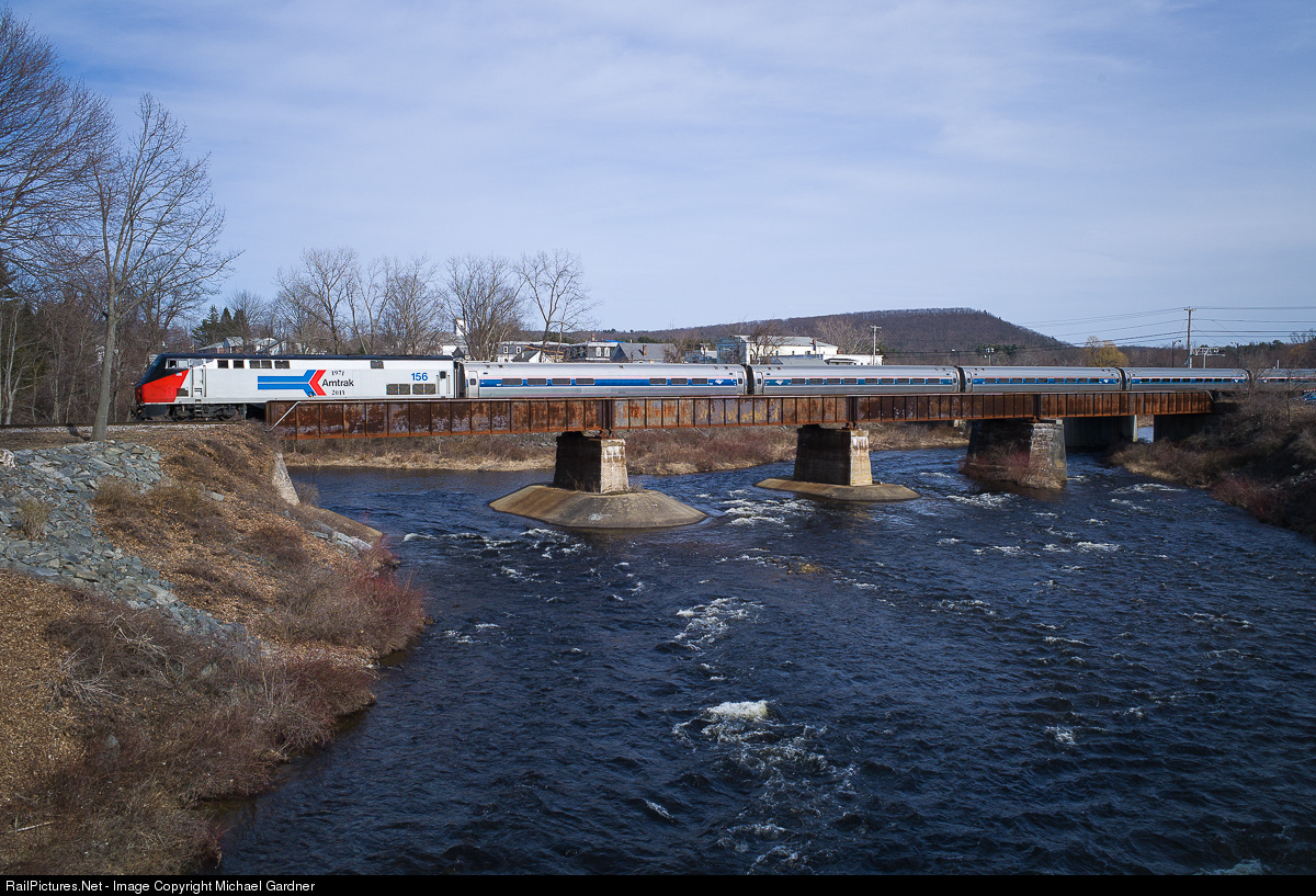 Amtrak train 56, the northbound Vermonter, led by engine 156 painted in the Phase 1 heritage scheme, is crossing the Chicopee River on its way to St. Albans, VT. After the end of 2014 the Vermonter trains will be following the Connecticut River north from Springfield, MA and will no longer travel this portion of the New England Central.
