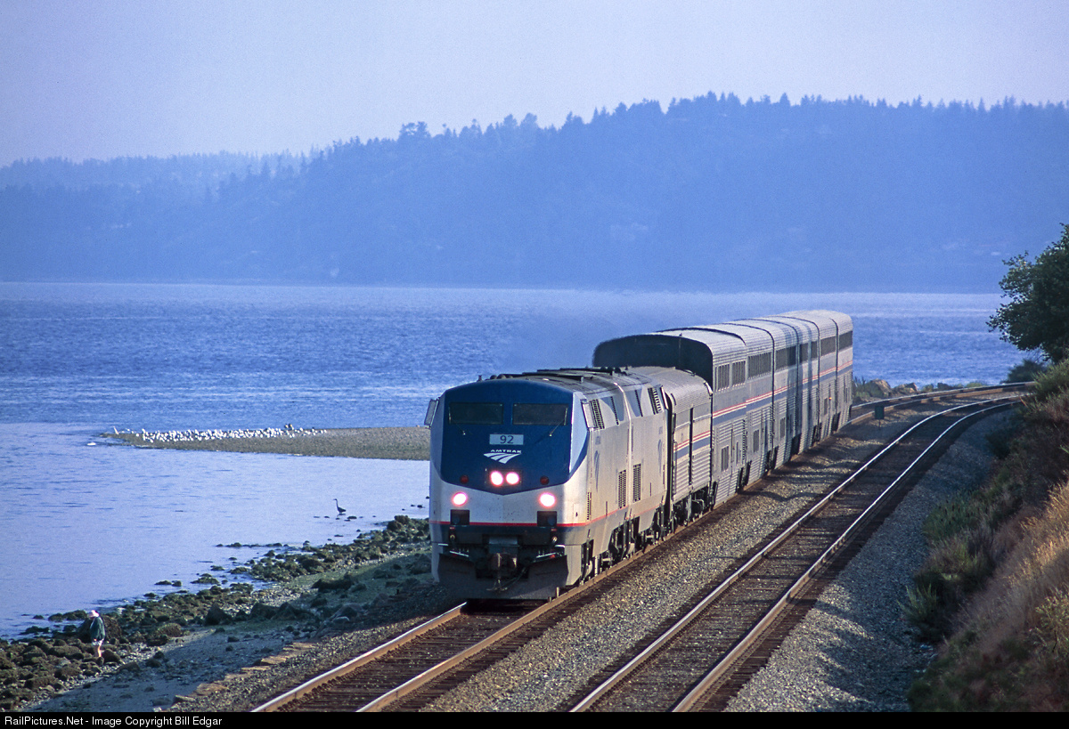 | Amtrak's Empire Builder does not concern bird life or a beachcomber as it slows for its station stop at Edmonds, Washington on its final lap into Seattle. Back in 2003 Amtrak offered reliable on time service on this route. Not so in 2014 where even with a schedule slowed to the point where a 6th train set has to be added, the westbound train can often run 5-6 hours late into Seattle. |
