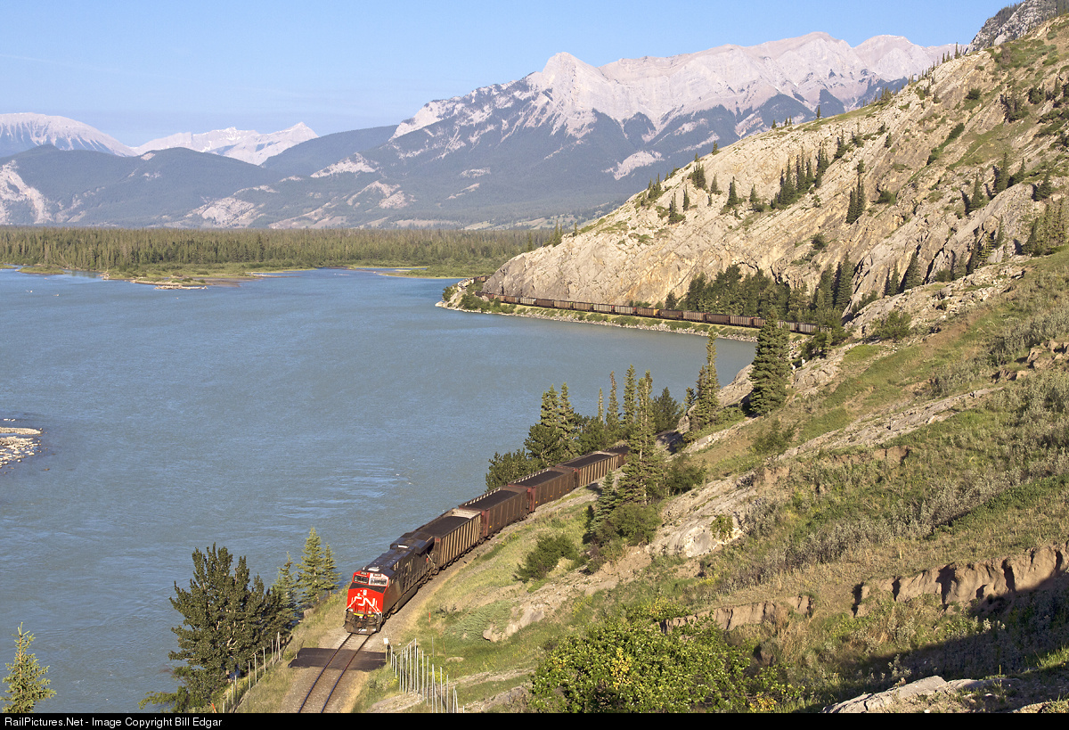 | Westbound coal train 769 has exited Parkgate Tunnel as DPU CN 2825 assists on its rear. The head of the train is about to enter a double track stretch at Parkgate as the train heads west along the Athabasca River to Jasper for a crew change. Note the sheep guard just ahead of the DPU. It's purpose is to keep sheep out of the tunnel. It does not work, and trains often sound their horns and roll quite slowly through the tunnel to prevent injury to the animals. |