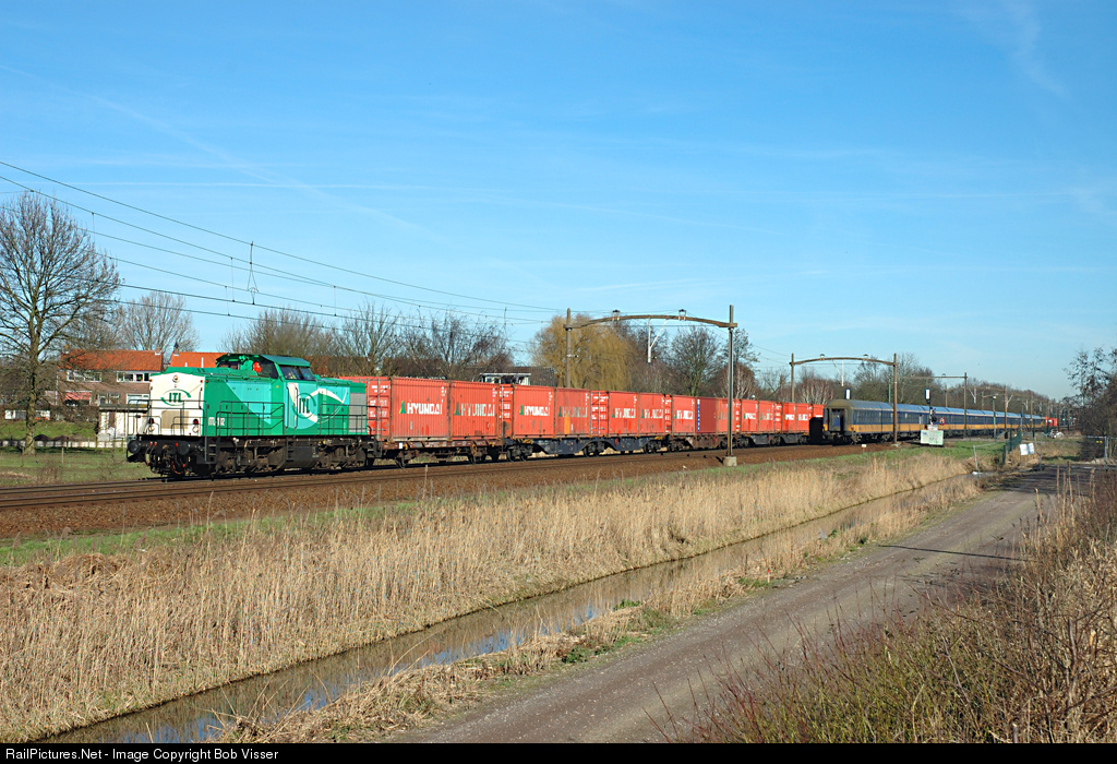 | ITL-102 with a containertrain to Tilburg. This locomotive was build in 1971 at LEW Hennigsdorf for DR (Deutsche Reichsbahn) under number 110 369-6. In 2002 it was rebuild at Alstom Stendal. The only reason that the railways of Eastern Germany was named Reichsbahn was that only under that name it could drive through West-Berlin. |