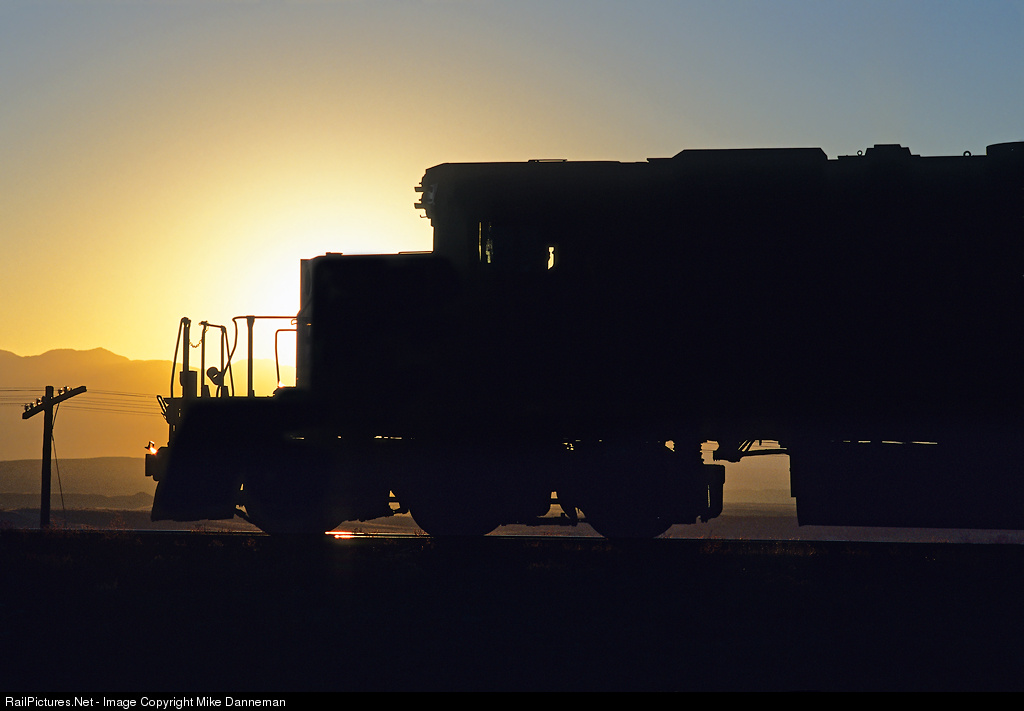 A rising sun brightly silhouettes Rio Grande EMD SD40T-2 No. 5371 as the local switches Mounds, Utah, on October 8, 2004. A stark nose profile of a variant of one of General Motors’ best selling locomotives.