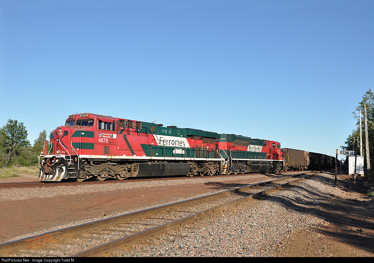 | On a cold late fall day in northern Minnesota where the temperature is currently only 2 degrees above zero and a wind chill advisory is in effect with wind chill values of 25 to 40 below zero it's nice to look at a shot from a warm summer day and think about Mexico. On a perfect late summer afternoon, FXE 4678 rolls west at BNSF Gunn Jct. with 504 total axels heading for the Magnetation Mining Co. load out pocket near Grand Rapids, MN. The crew at Magnetation has 24 hours to load and weigh the train out and get it ready for the return trip to Mexico. It's fairly rare to see four (there's two on the rear) Ferromex engines in northern Minnesota on a single train.