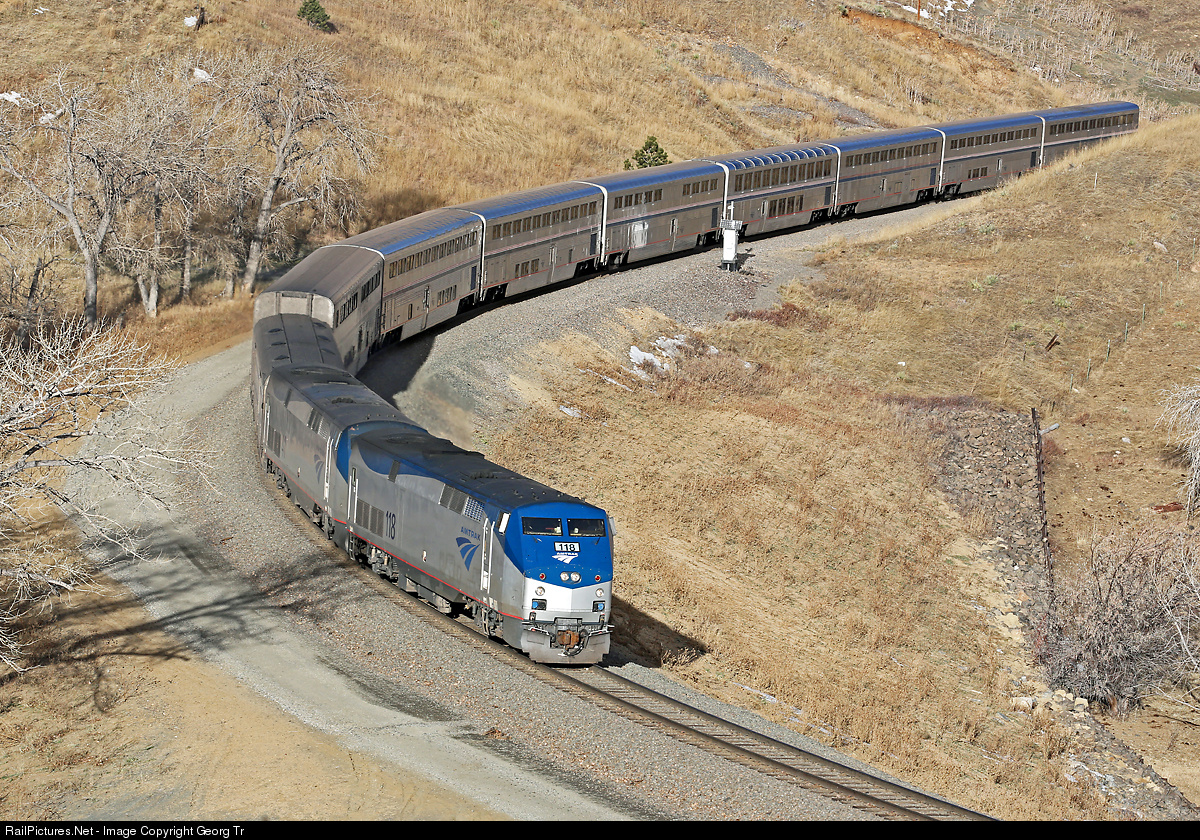 Amtrak train # 5 "The California Zephyr" on the 2.0 % grade from Denver to the front range of the Rocky Mountains, pulled by P42 # 118 and 41, nearing the "Big 10 curve".
