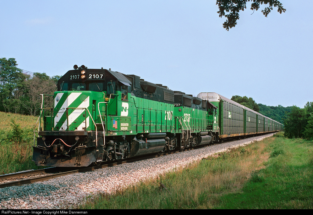 A westbound Burlington Northern freight passes through Budd near East Dubuque, Illinois, on the afternoon of August 21, 1994. Cascade green EMD GP38-2 No. 2107 leads newer GP39-2 No. 2737, on a train that almost looking like a publicity shot with all of those matching BN autoracks.