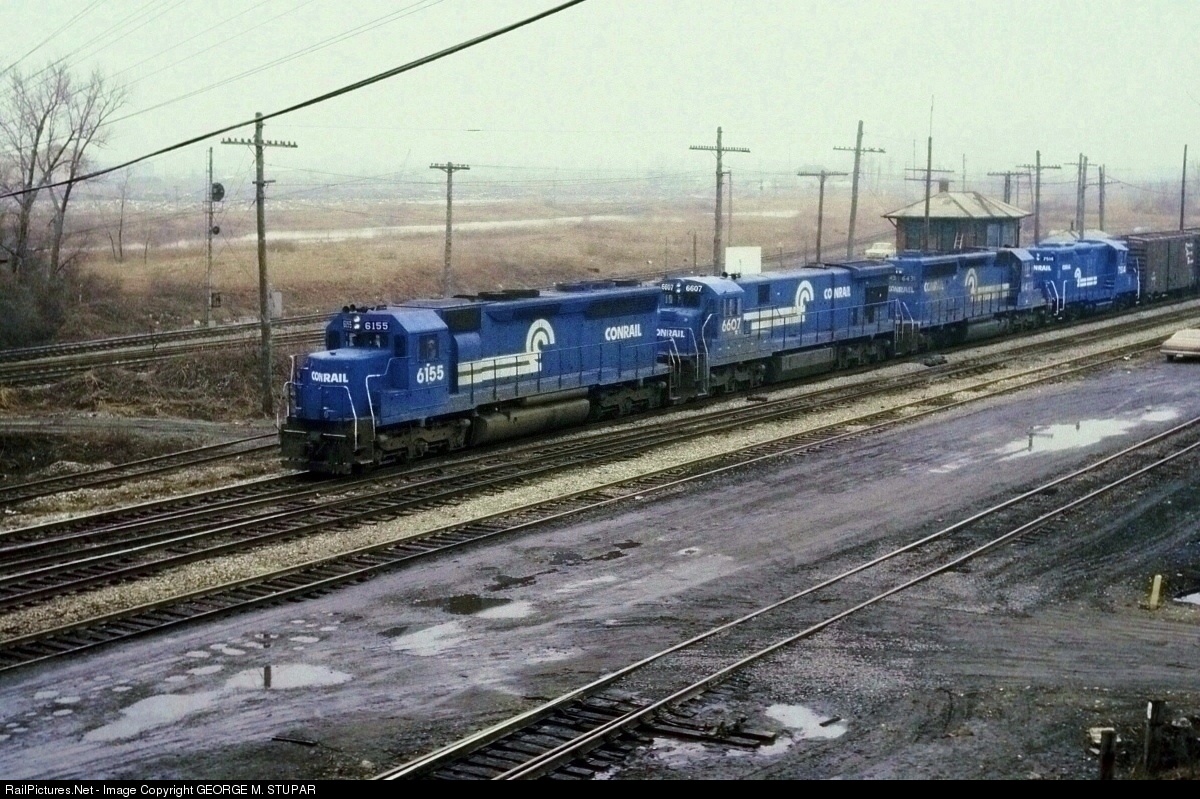 A quartet of "Big Blue" motors brighten the scene on a dismal day as they take a manifest freight east through the grit and grime of heavily industrialized Northwest Indiana in 1979. Seen here on the Chicago Line passing Nero tower at Pine junction.