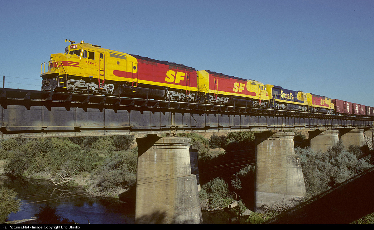 An eastbound Santa Fe manifest crosses the Tuolumne River bridge south of Empire, CA. I saw this consist in the Richmond locomotive facilities the night before and drove out to Empire during the night to wait for this train.