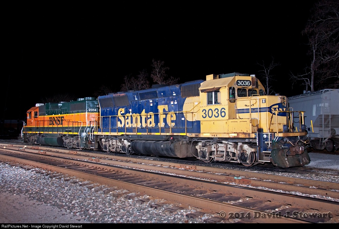 A rare visitor to the Southeast is former ATSF GP40X, BNSF NÂș3036 which has been roaming the southern end of BNSF for the last several months. Built in April 1978 as ATSF 3806, the unit is part of the largest order consisting of ten units purchased by ATSF. BNSF 3036 is currently assigned to the New Albany local and is teamed up with BNSF GP38-2 2314. New Albany, Ms. November 30,2014