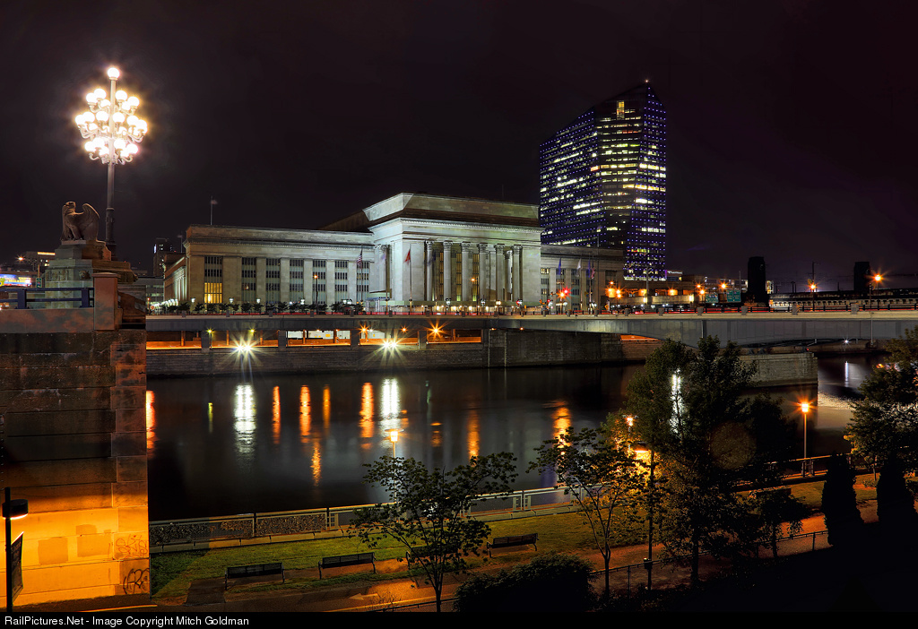 Philadelphia's iconic 30th Street Station: Built by the Pennsylvania Railroad and opened in 1933, the station today sits in the company of the 29 story Cira Center built in 2005 and, notably, a former Penn Station eagle installed on each corner of Philadelphia's Market Street Bridge. The remaining 18 eagles, survivors of New York City's PRR Penn Station can be found here.