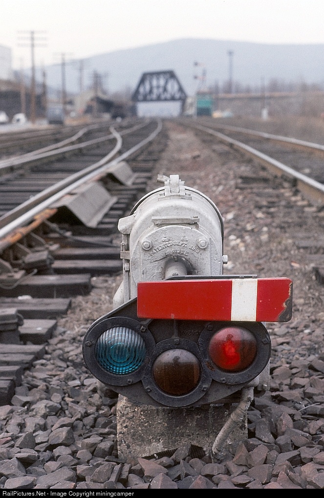| Dwarf semaphore. This protected Lehighton Interlocking, the junction where Jersey Central and LV traffic entered Packerton Yards in Lehighton, PA. The bridge in the distance once carried Jersey Central trains over the LV mainline. By the time of this photo, the Jersey Central mainline had been mostly removed from Lehighton to White Haven in favor of the LV mainline. Ektachrome X. |