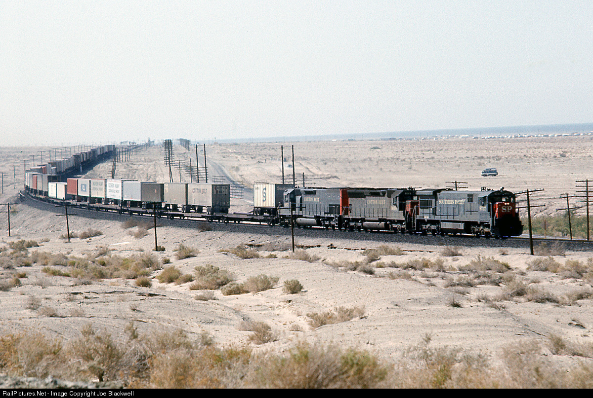 A westbound SP pig train was approaching Ferrum Jct near the shores of Salton Sea back when it was safe to swim in and a popular place to spend a weekend.