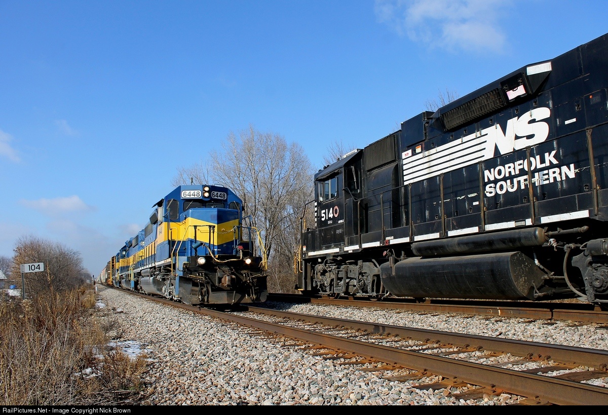 Gliding down into Pewaukee, RCPE (ex ICE) 6448 leads CP 470 east while meeting NS 5140 west with CP 641
