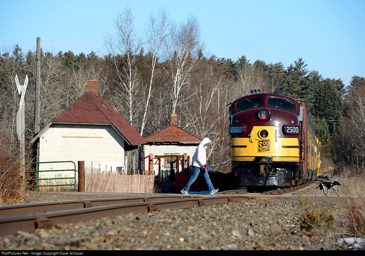 A beautiful day in northeastern Minnesota finds the natives out walking their dogs and riding a special train to a winter festival in Knife River. Soo 2500A's rotating Mars light indicates the train is secured and stopped.