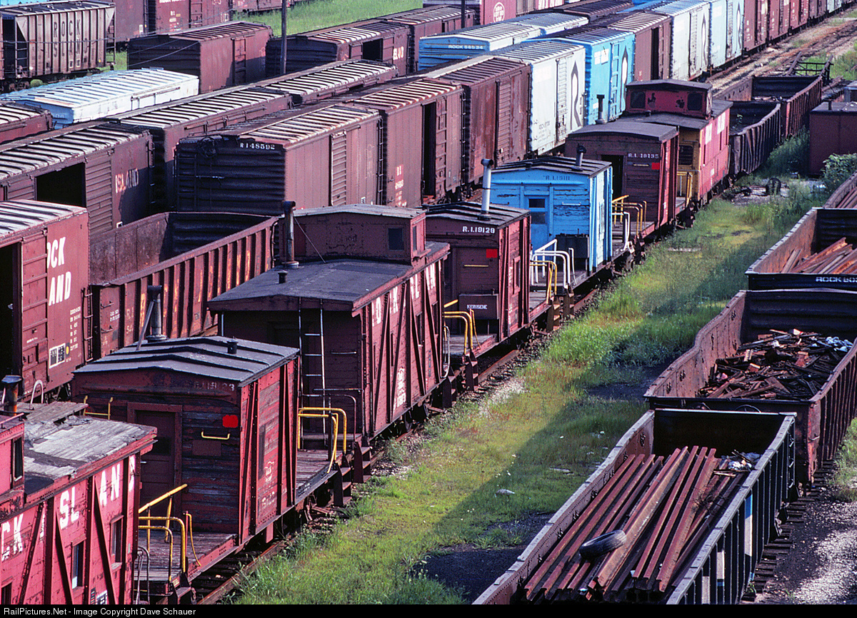 A string of transfer cabooses mingle with unused cars awaiting disposition after the demise of the Rock Island. Gondolas on the right are loaded with salvaged rail.
