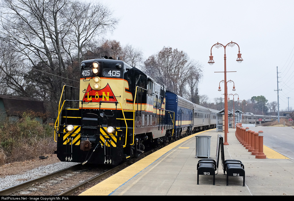 | Beautifully restored L&N 405 rolls around the elevated curve past the Donelson Passenger Station. Built in 1951 for L&N, this GP7 now pulls excursion trains for the Tennessee Central Railway Museum, such as today's North Pole Express. Even the clouds of a cold winter's day can't dim the beauty of this classic locomotive. |