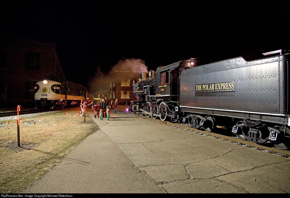 The Polar Express at the North Carolina Transportation Museum behind Southern FP7 6133 unloads passengers while Southern 2-8-0 542 looks on.