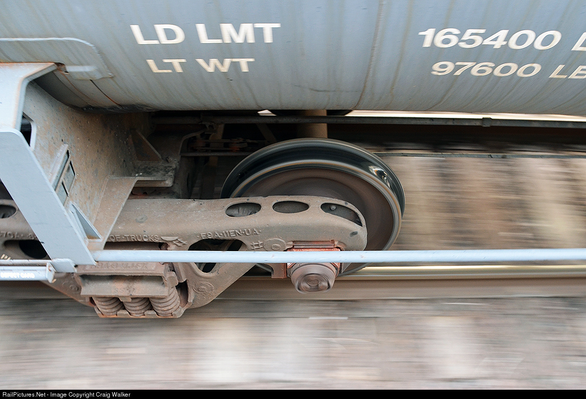 A steel wheel rolling along a steel rail is very efficient way to move heavy cargo. Here we see one of those wheels under a tank car, rolling along at about 40 miles per hour as BNSF Railway's Barstow to San Diego train, nicknamed the "Dego" by crews, winds its way through the northern end of Victorville, California, on December 15th, 2014.