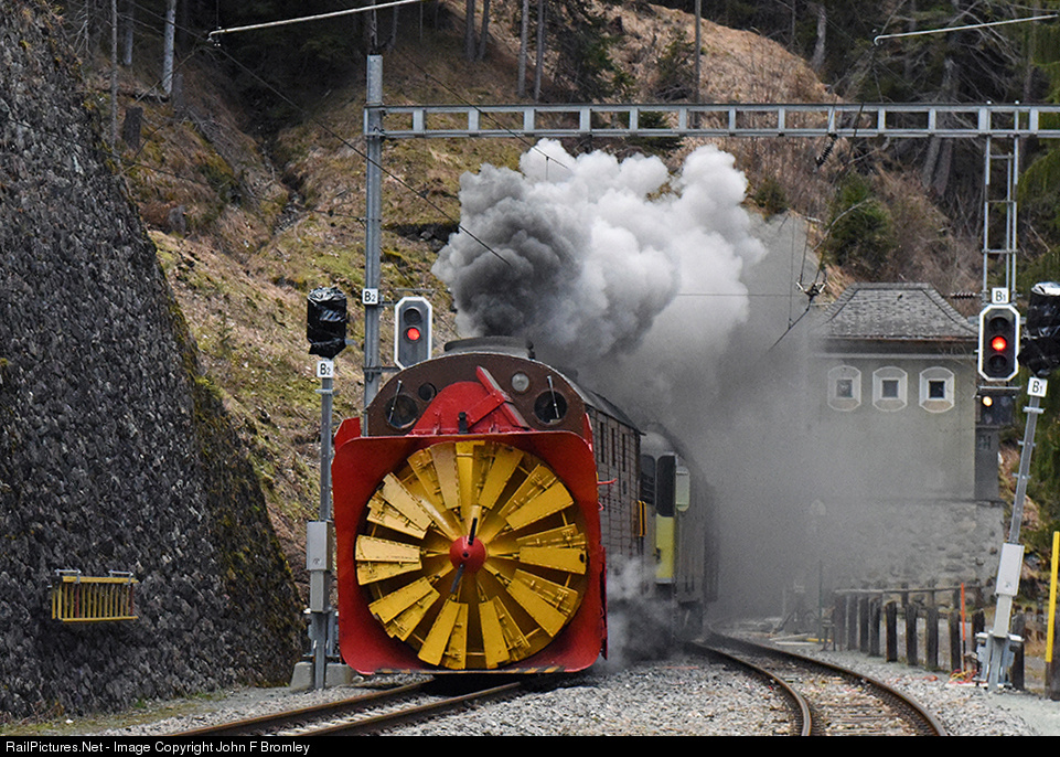 | RhB's steam plow X9213 on a transfer run from Landquart via the Albula line storms out of the Passmal Tunnel at Solis in this exclusive photo while on its way to Pontresina for the night. Thick smoke kept emerging from the tunnel for several minutes afterwards! That's 611 behind, towing a boxcar.