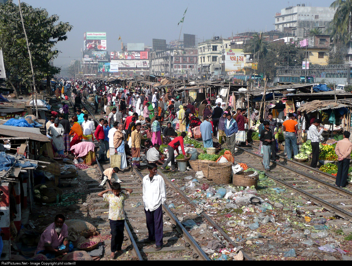 | A market in the Malibag area of Dhaka spills across the mixed gauge main line, just over a mile from Dhaka`s main station. For a view of a train passing through see...