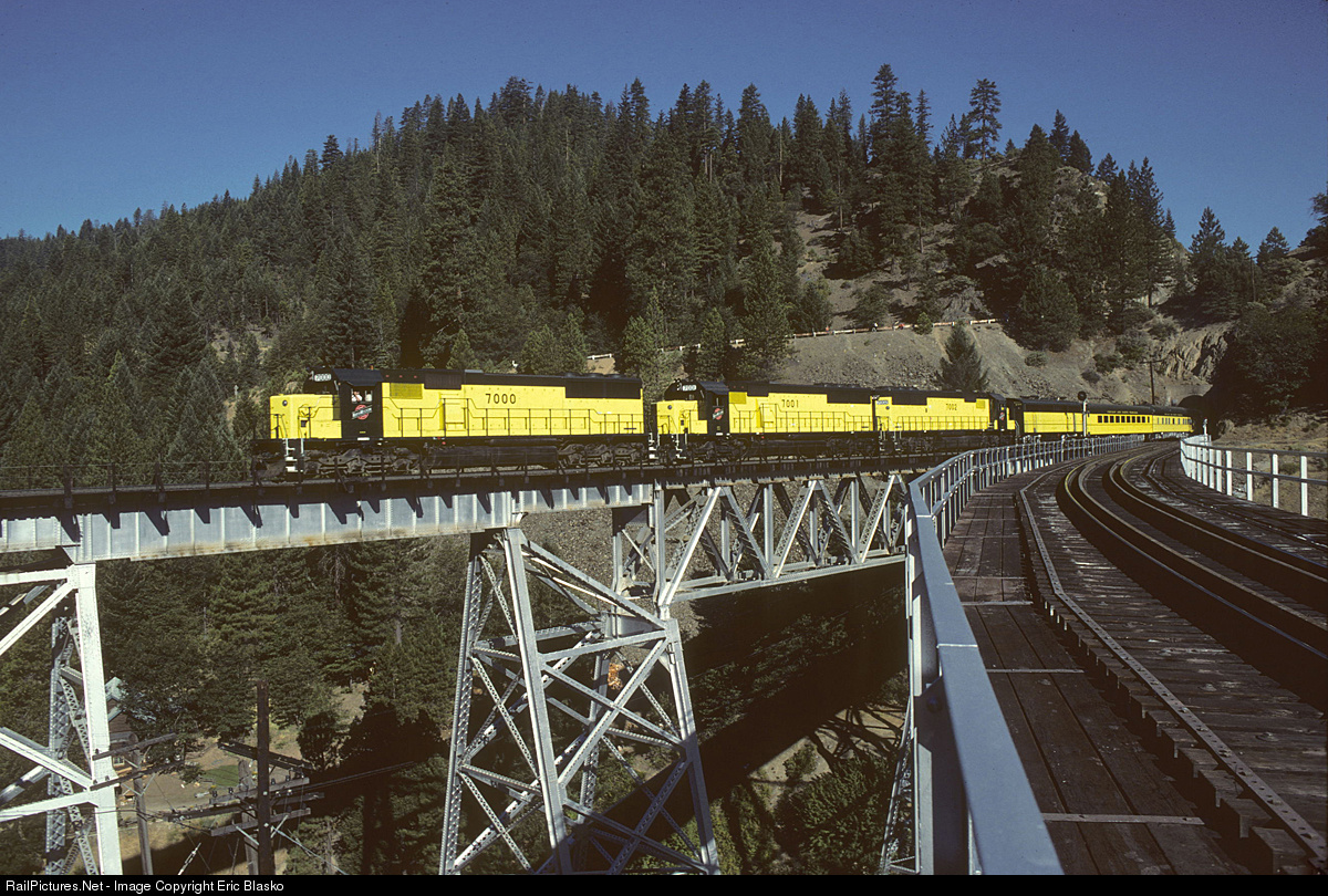 An American Association of Railroads special train with all C&NW equipment roars over the Keddie bridge on its way east after visiting the San Francisco Bay Area via UP rails.