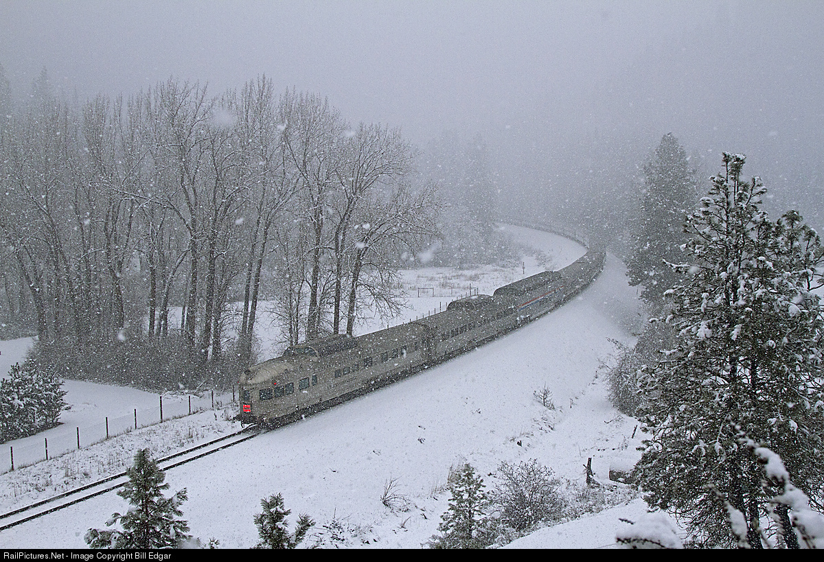 Snow flakes abound for the Leavenworth Snow Train's final run from Seattle to Leavenworth and return for 2014. The train featured Amfleet, Horizon fleet, a former GN great dome lounge, and a pair of ex-California Zephyr domes. A day earlier there was no snow here.