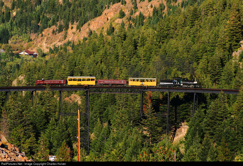 Georgetown, Colorado - September 17, 2010. A Georgetown Loop Railroad steam train travels across the curved trestle across Clear Creek in the Rocky Mountains of Colorado. Steam locomotive # 12 powered the 4-car train on its way to the depot in Silver Plume, CO.