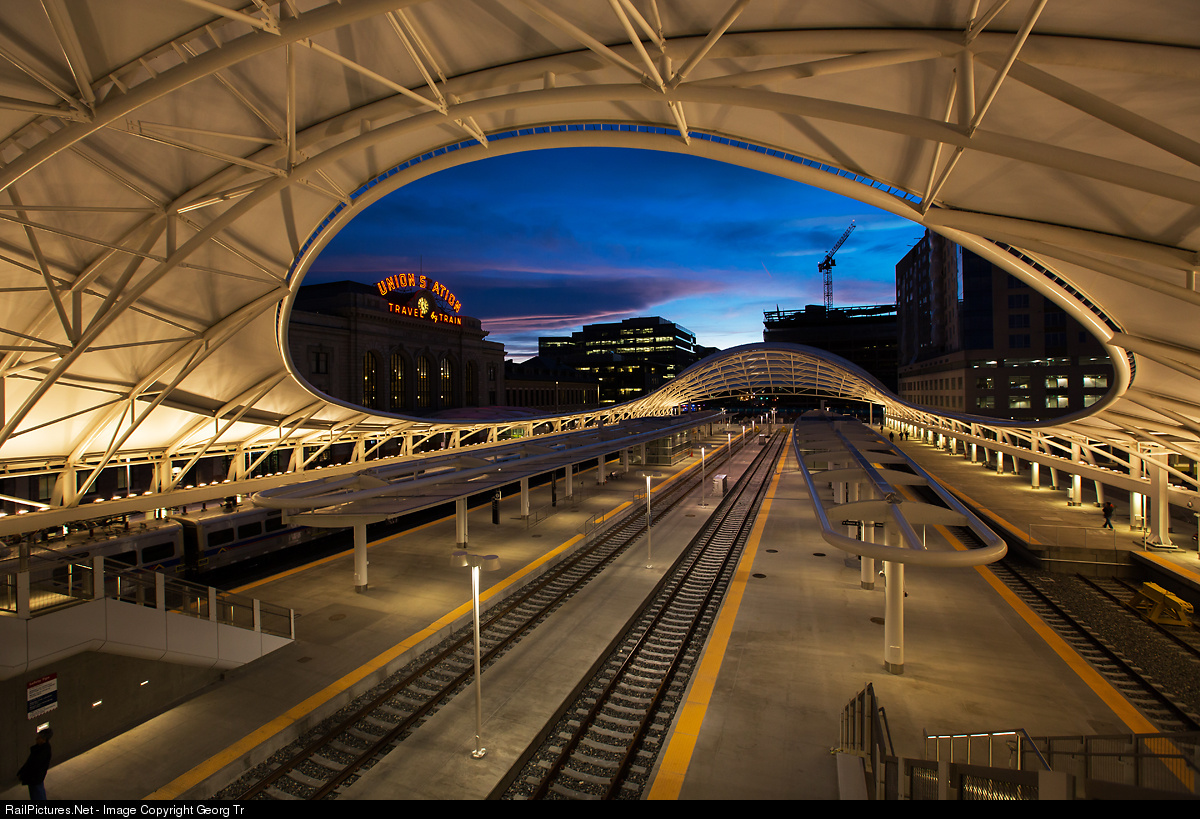The new open train hall with futuristic canopy of Denver Union Station in the blue hour. One daily train pair only in the moment....Amtraks "California Zephyr", but more trains to come in 2016 with RTD commuter lines.