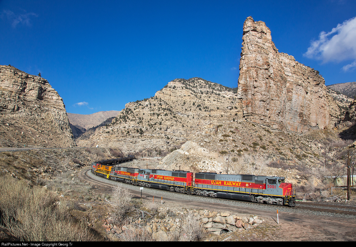 Empty tank car train rolling down Soldier pass with the towering Castel Gate rock in the background. Pulling are Morrison Knudsen built MK5000C from 1994/1995, now rebuilt and reclassed as MK50-3, # 5001 and # 5002, SD50S # 6062, SD50S # 6064 in orange G&W paint scheme and MK5000C # 5004.