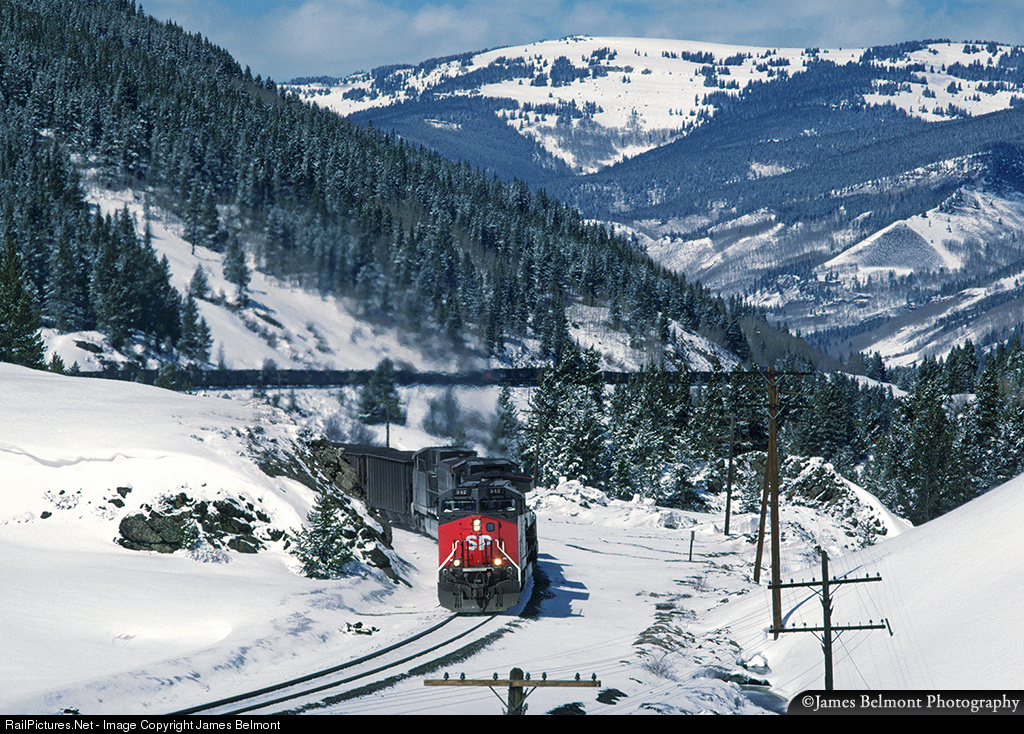A Southern Pacific coal load climbs the steep Tennessee Pass Subdivision a mile or two below the summit on a sunny March 29, 1997 afternoon. The 100 car train had three AC4400CWs on the point, four cut in as manned helpers and two more on the rear. Gotta love mountain railroading above 10,000 feet!