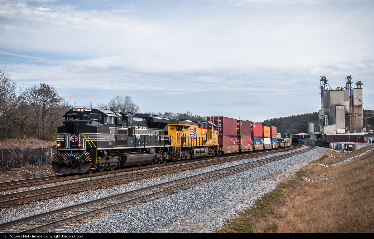 | Two of the most iconic paint schemes in American railroading come together as Norfolk Southern's New York Central heritage SD70ACe and a Union Pacific GE ES44AC haul a long post-Christmas 221 to Atlanta's Inman Yard. Here the train is seen rolling past the milepost 584 and Purina feed mill, where a new third track to New Holland has been put in. |