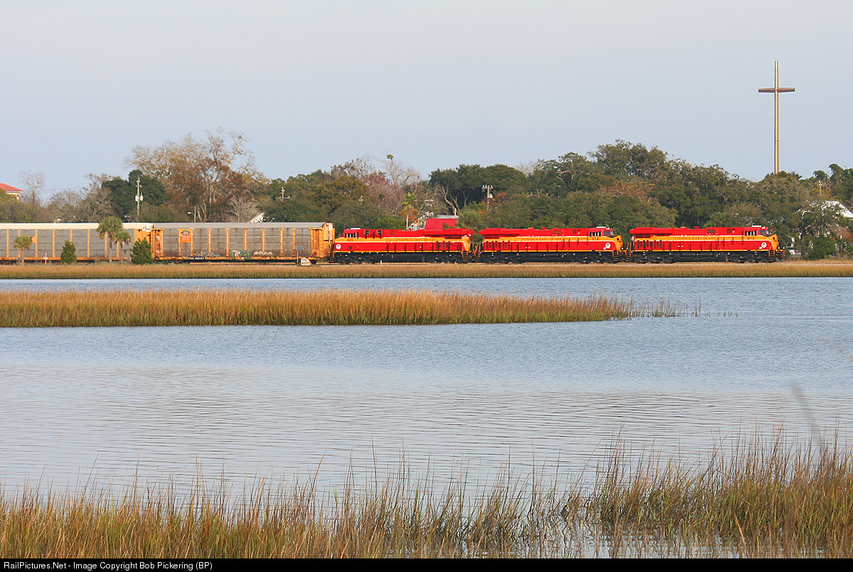FEC 101 bound for Miami with triple big champs, rolls along the tidewater in St. Augustine. The Mission Cross a well known landmark stands in the distance on this 80 degree day.