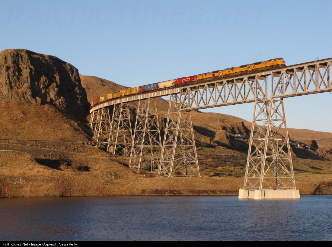 Just after sunrise, a northbound UP manifest steps out onto the massive Joso Bridge, soaring high above the Snake River. The line to Lewiston, ID, now operated by Great Northwest Railroad can be seen between the second and third supports.