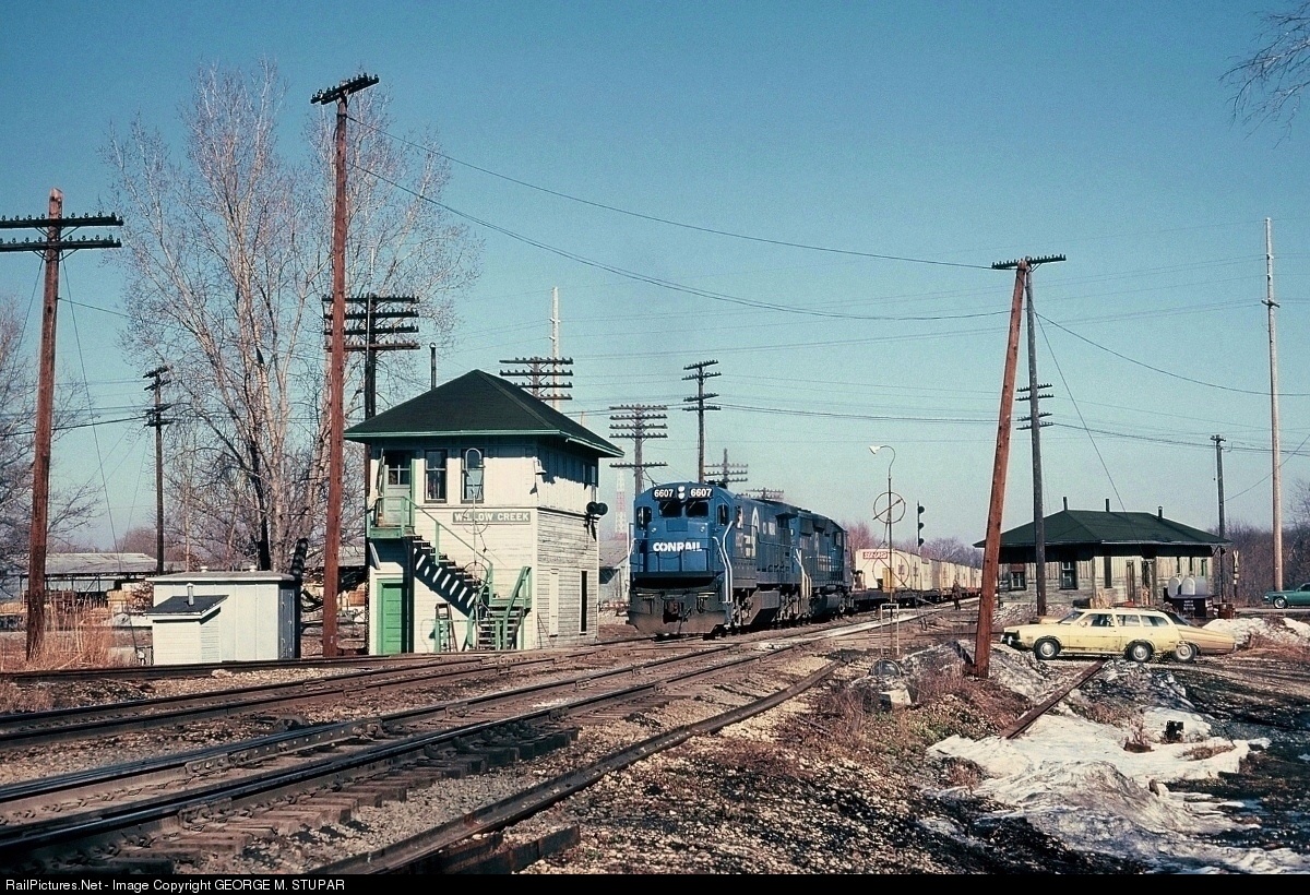 | A view of Willow Creek Junction prior to its reconfiguration and modernization by CSX. Obviously there were many more track-side structures on the railroad in 1979. The TOFC hot shot is crossing the old B&O Garrett Sub and is about to slam across the N&W ex Wabash 4th District as it speeds west on the former NYC Michigan Central Porter Branch double track main. |