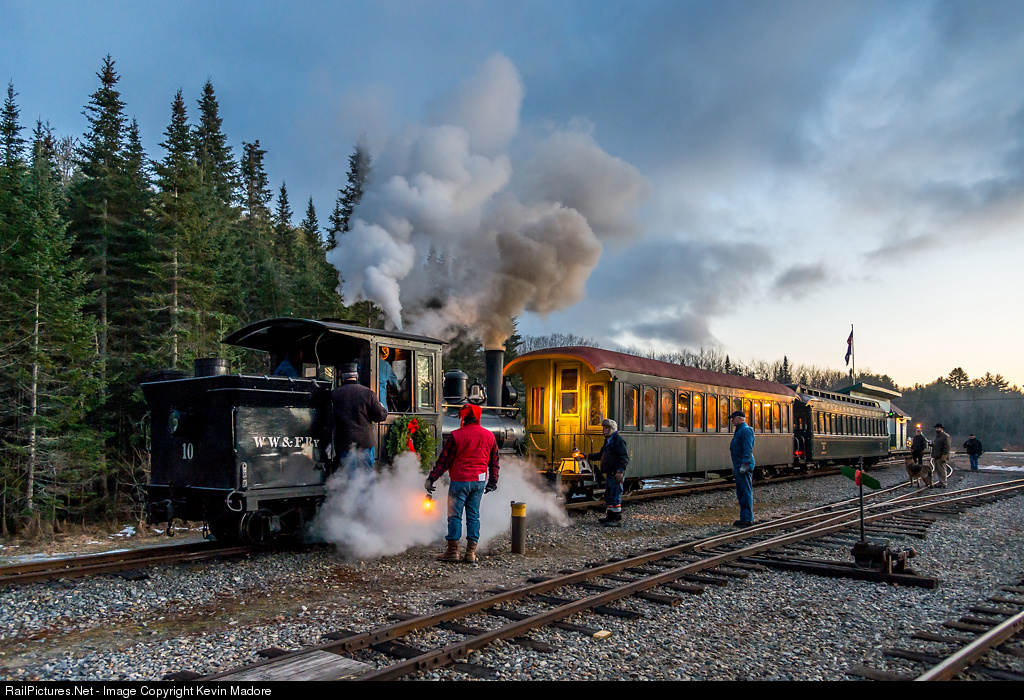 Take the last train to Alna Center.... Conductor John Roberts (with the fur hat) uses his kerosene-burning lantern to direct Engineer Bob Longo in coupling Locomotive #10 to Coach 8 for the last trip of 2014.....a night run to Alna Center. They will take only two coaches tonight, as the crowds from the museum's Victorian Christmas event have now departed for home. Earlier in the day, the crews were running 5-car trains, including every piece of rolling stock that could safely carry people. One of those trains had nearly 200 people on it. Two of the cars in use during the peak of the event were open excursion cars, and with temperatures topping out at about 30F today, the ride had to be pretty sporty on those. Still, Mainers are hardy people, and there was no shortage of folks willing to ride those open cars. Now, the folks left in the yard are mainly narrow gauge die-hards...either museum folks or railfans, who just can't walk away from a locomotive with a fire in it. They will fill the two coaches and spend the next 40 minutes soaking in the look and feel of nighttime railroading, the way it was back about 1915.
