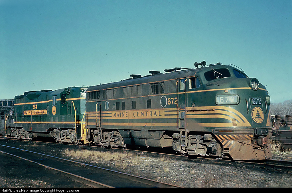 Maine Central EMD F3(A) #672 and GP7#564 in Bangor, Maine November 1966. The end is near for 672 and her sisters, a dozen new GP38's were on order to replace them. No photographer listed on slide.