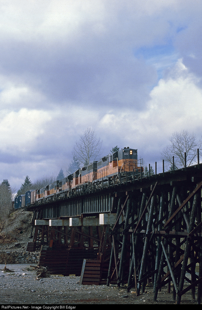 A Milwaukee freight consisting of a GP9/GP35/U25B/U30B/U28B quintet rolls northbound across a river near McKenna, WA en route from Portland, OR to Tacoma. After the BN merger, Milwaukee Road gained significant traffic from the Portland gateway, but had to use a mixture of BN trackage rights and what were essentially logging branches to get their trains over the road. Their operating costs were significantly higher than BN or UP in this corridor.