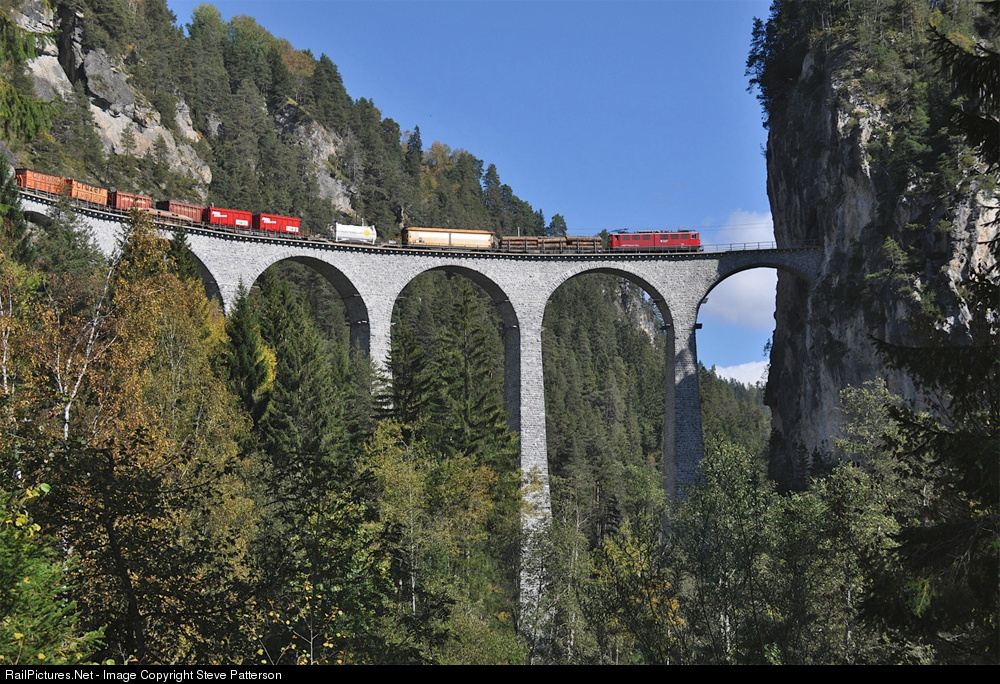 A southbound Rhatische Bahn freight train crosses Switzerland’s famous Landwasser Viaduct to plunge into a tunnel on the cliffside.