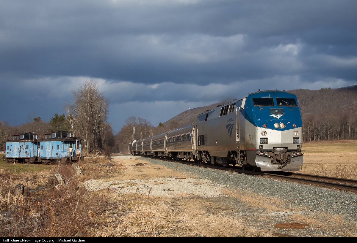 | Amtrak train 55, the southward Vermonter, is seen on the newly upgraded Pan Am Connecticut River Line, currently part of the planned Knowledge Corridor. Until December 29 the train ran via Palmer and Amherst Massachusetts on the New England Central. The new route runs directly north from Springfield to East Northfield Massachusetts saving time and a reverse move at Palmer. Two privately owned cabooses are seen on the left. |