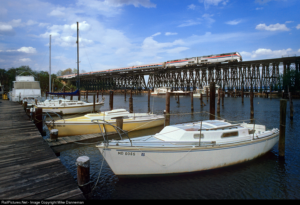 Amtrak’s Auto Train heads over Neabsco Creek Bridge near Woodbridge, Virginia, on April 23, 1996. The train is powered by a pair of GE P40DC (Nos. 831 and 833) locomotives.