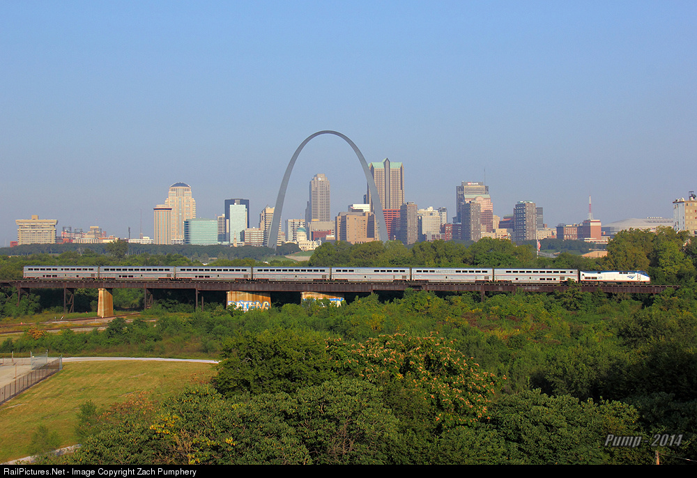The Texas Eagle #21 glides over the river and above the woods, safely elevated overhead the ghetto that is East St. Louis on the TRRA Pennsy Turnout, but not before offering the always spectacular view of the Arch and downtown to the passengers onboard.