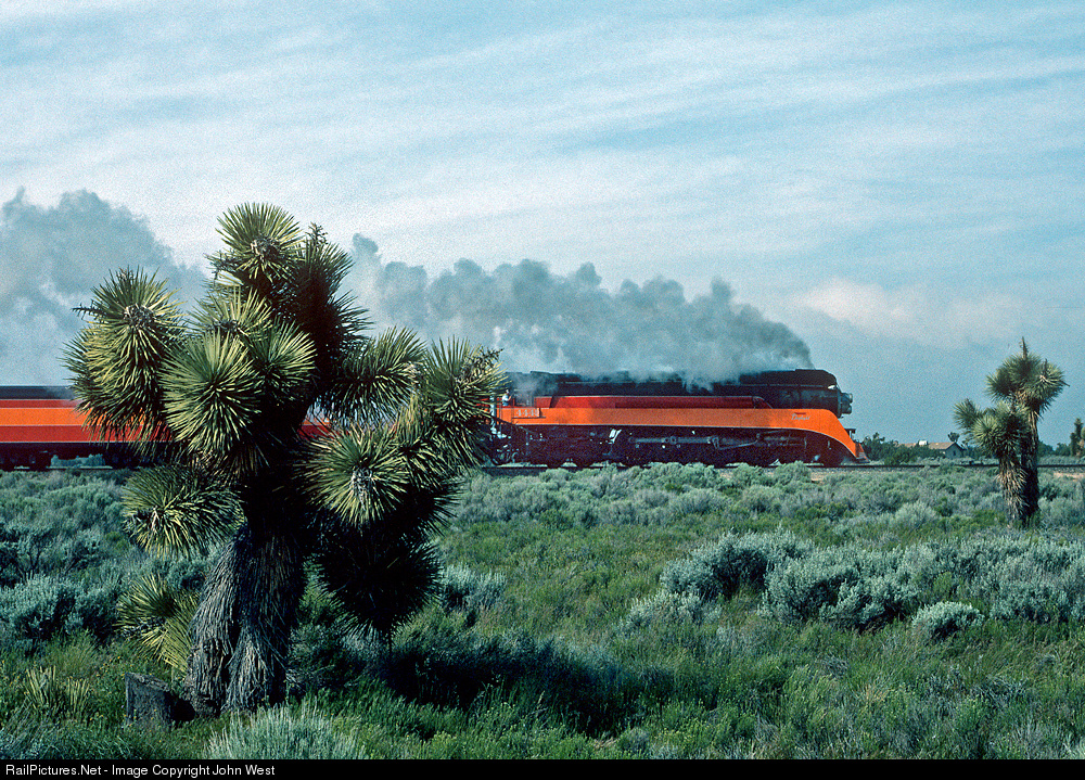 After the filming of "Tough Guys" in the LA Basin, 4449 and its train heads home to Portland via Cajon and Tehachapi passes. Here it is on the Palmdale cutoff, somewhere west of Victorville, passing some of the unusual "joshua trees" that are native to the area.
