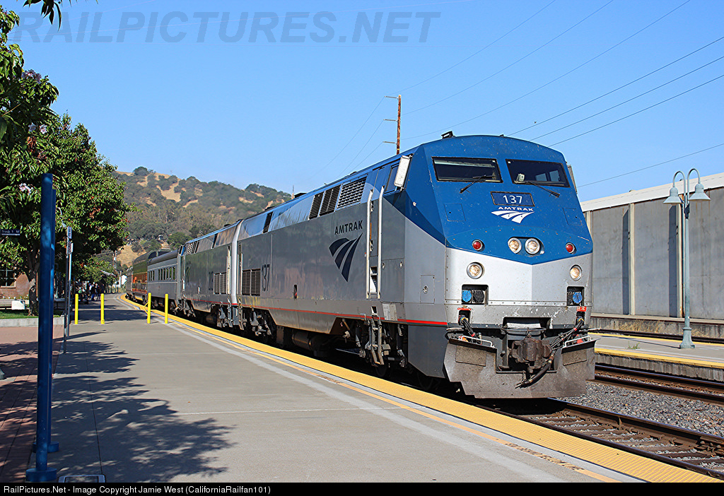 Finally, after three years, the Feather River Express is back! Here, Amtrak P42DCs #137 and #203 lead the special train consisting of eight private cars into the Martinez Amtrak station. The train is enroute to Portola, CA for the Portola Railroad Days.