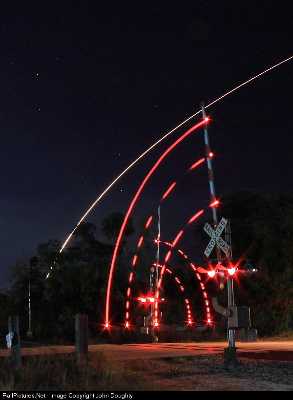 As the crossing gates go down for southbound FEC train 107, an Atlas rocket takes off from Cape Canaveral. I initially set up about 20 miles north in Rockledge with the hope of getting the 107 train and the rocket launch together, however, when I heard the launch was on hold, I packed my camera gear, jumped in the car, and headed south. When I heard over the radio the new time for the launch, I tried to estimate where the train would be when the rocket took off. Barely keeping ahead of the train, I guessed the south end of the Palm Bay siding would be my best hope for the train and the rocket launch. I arrived with three minutes to spare, jumped out of my car, set up my tripod and camera, and started the exposure about 10 seconds before the rocket took off. I had no idea where the rocket launch would be in relation to the crossing gates, so a lot of it was "luck".