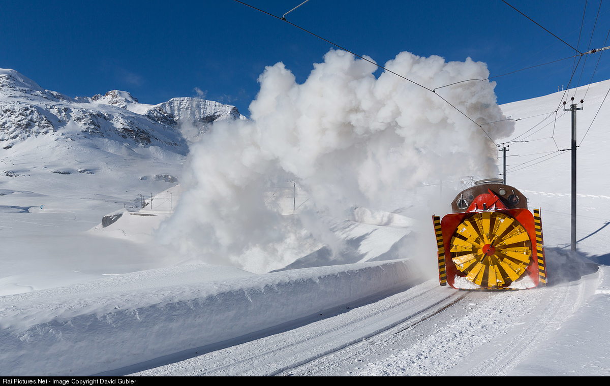 | The "Bernina Monster" is hungry... for more snow! It's always a great show when they take the steam-powered rotary Xrot d out of the shed and put it into action, typically together with a "Räumer" to increase clearance and put snow onto the track. |