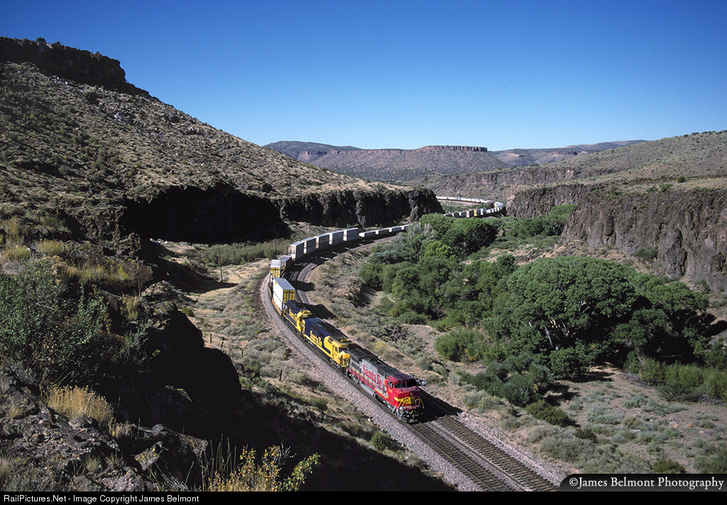 A Santa Fe intermodal snakes through Arizona's Crozier Canyon on Oct. 8, 1995.