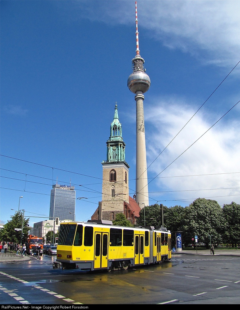 Shortly after a brief but soaking rainstorm, a 1980s built BVG Yellow Tram rounds the curve in front of Alexanderplatz in Berlin, Germany. Looming in the distance, at 368.03 m (1,207.45 ft) the Berlin TV Tower or Fernsehturm is still the tallest structure in Germany, remaining one of the city's more recognizable icons.