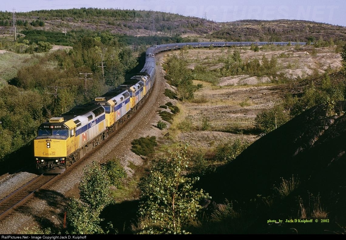 | VIA 6414-6419-6413-6434, train #1, with 27 cars, on the CNR at Coniston, ONT. 9/17/2002 |