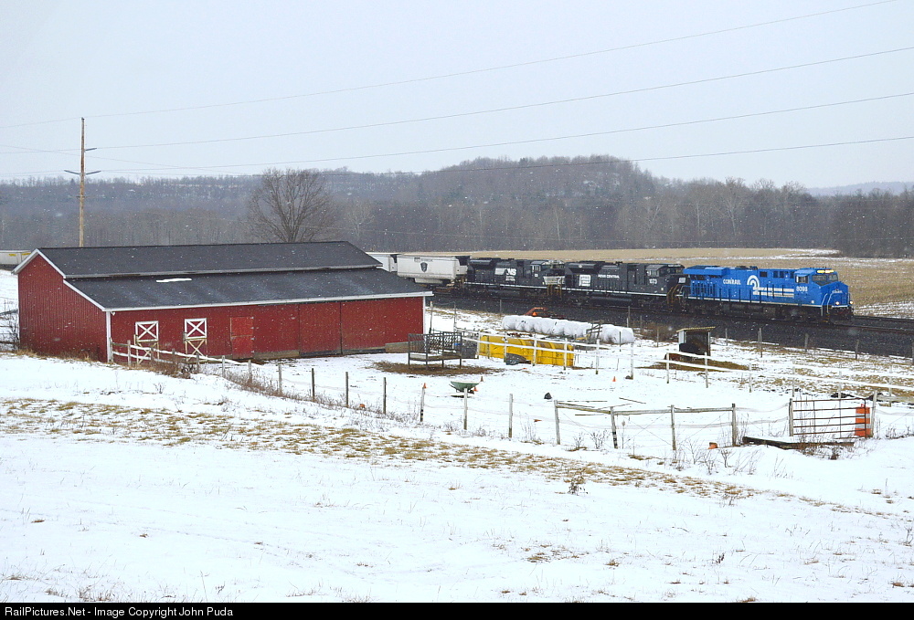 | Looking like an early Conrail lash up, 24M heads east passing a small farm just outside of New Galilee, PA with the Conrail and Penn Central heritage units along with NS 1011. |