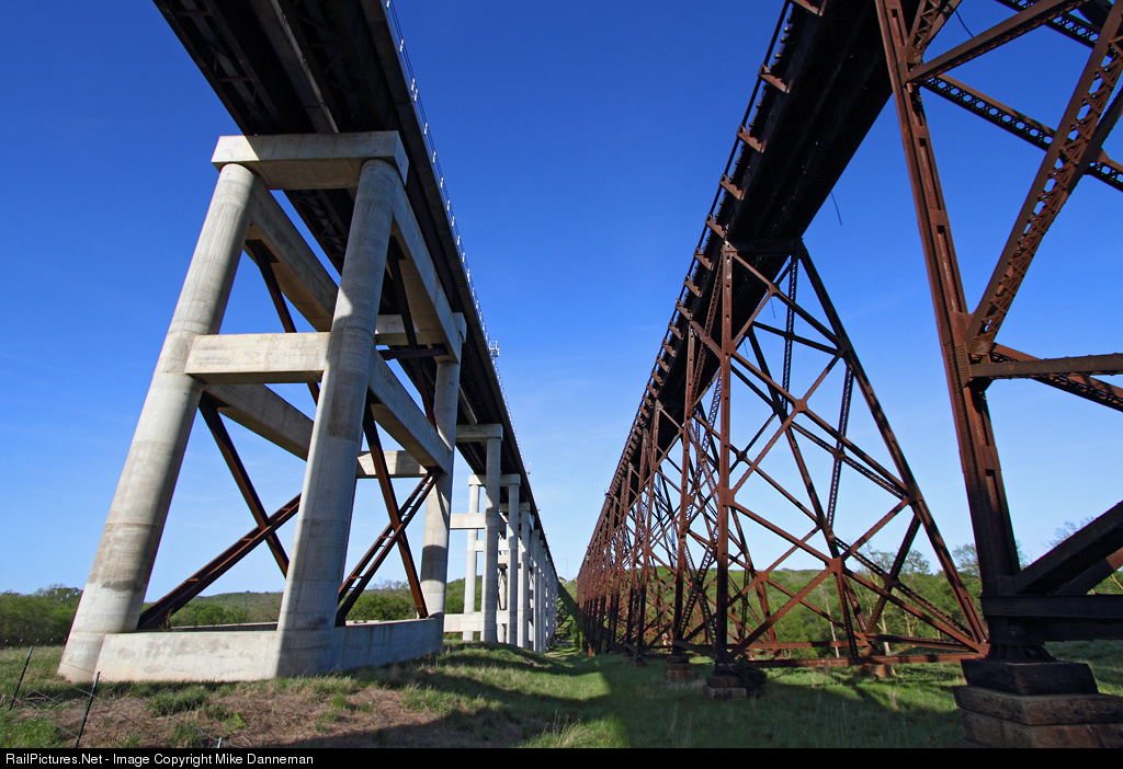 The original bridge over the Des Moines River at this location 3 miles west of Boone was constructed by the Chicago and North Western from 1899-1901, and eventually was named the Kate Shelley Bridge for a local Iowa heroine. By the mid-1950s, the double track bridge was limited to one train at a time, and had a permanent slow order. Eventual owner Union Pacific constructed a new concrete and steel double track viaduct from 2006-2009 which can now handle two trains simultaneously at 70 mph. The old bridge still stands today just to the south, unused and a monument to a different era of bridge building.