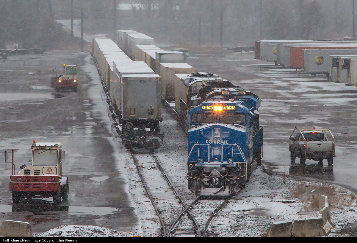 Today's Chicago to Baltimore 24M came down the North East Corridor in the pre-dawn hours. Now, in the early morning snow and wind the Conrail and Penn Central Heritage Units shove their last cut of cars into the pocket sized Lombard Street Intermodal Terminal on the east side of town.