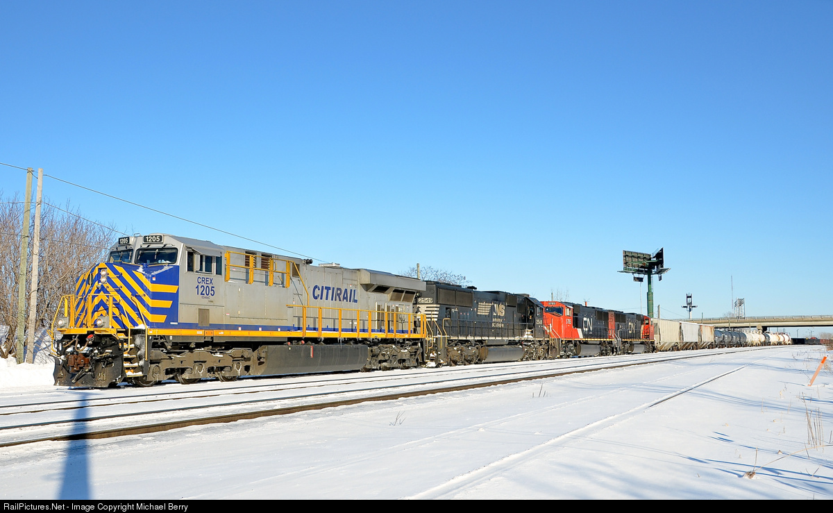 Citirail GEVO on a CN local. CN 527 is switching at the western end of Southwark Yard in St-Lambert with CREX 1205, NS2549, CN 5875 & CN 5632. The last two units will head to Toronto on CN X321. The first two units will head to nearby Taschereau Yard with a local transfer (CN 527). The Citirail and NS units entered Montreal on CN 529 Friday morning. On Friday afternoon they left for Richmond, Qc on CN 394 and CN 393 only made it as far as Southwark yard before having to tie up, which explains why the power was in Southwark.